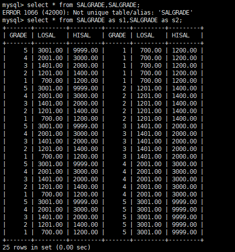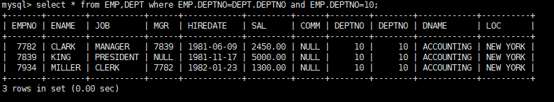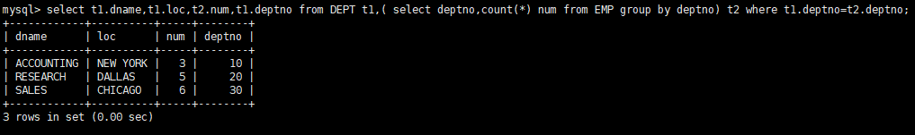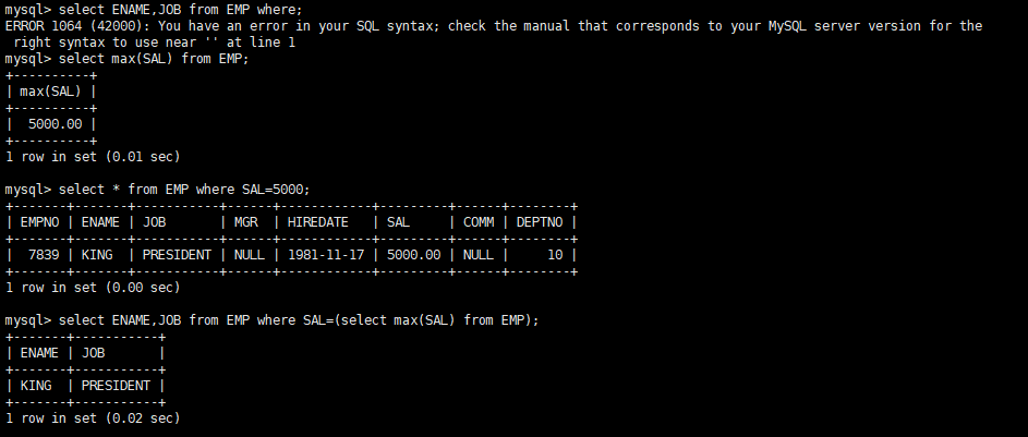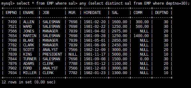 mysql> select ename,sal,t1.deptno,mymax from EMP t1,(select deptno,max(sal) mymax from EMP group by deptno) as t2 where t1.deptno=t2.deptno and t1.sal=t2.mymax;