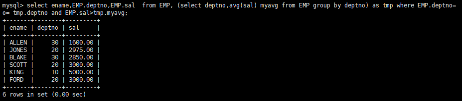 select * from EMP, (select deptno,avg(sal) myavg from EMP group by deptno) as tmp (必须重命名)