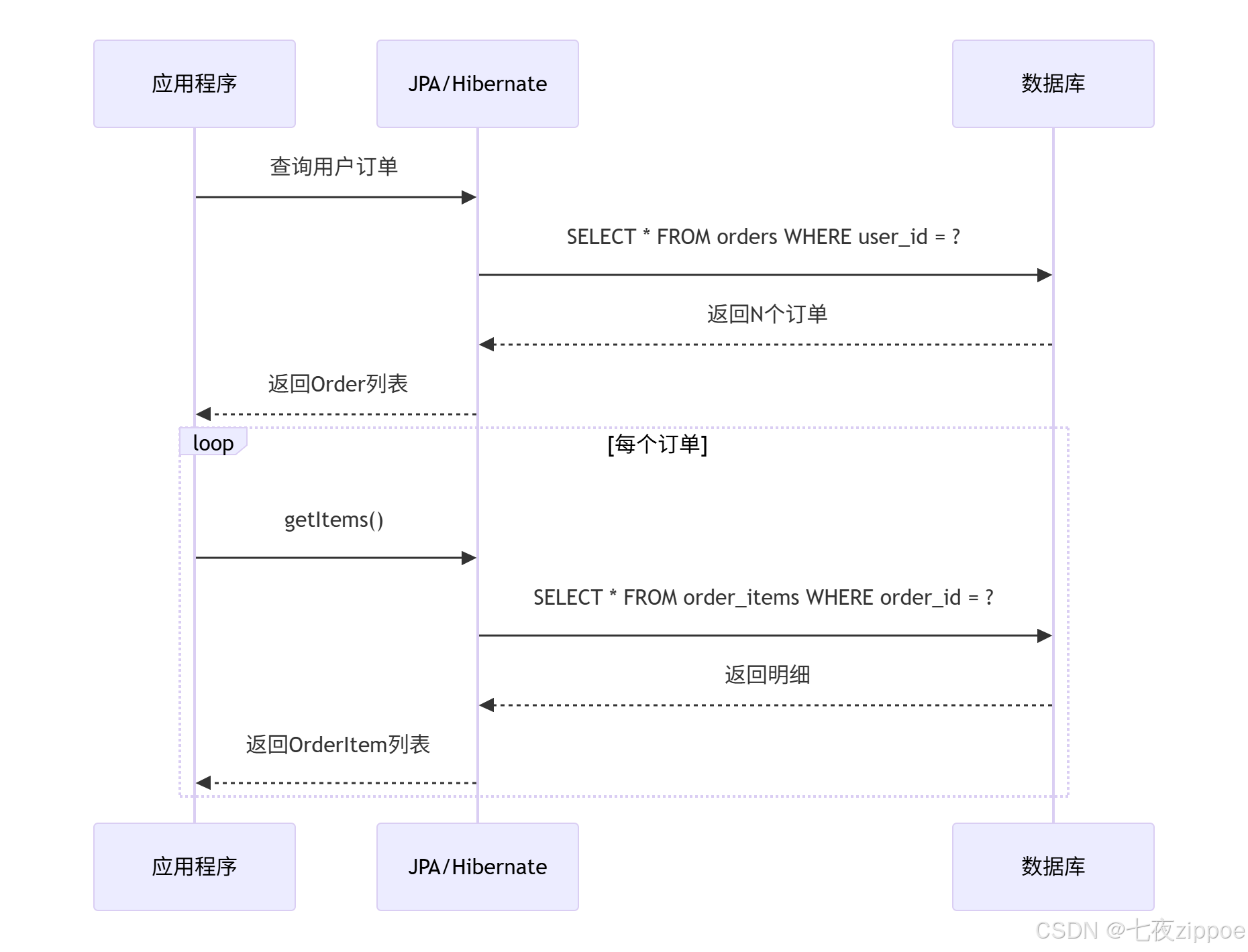 // 2. 遍历访问每个订单的明细(N条SQL!)
