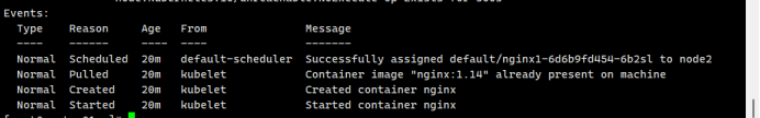 - Kubernetes 集群中 Pod 的事件(Events)日志截图,记录的是名为nginx1-6d6b9fd454-6b2sl的 Pod 在启动阶段的生命周期事件,用于展示该 Pod 在集群中的调度、容器创建与启动。
