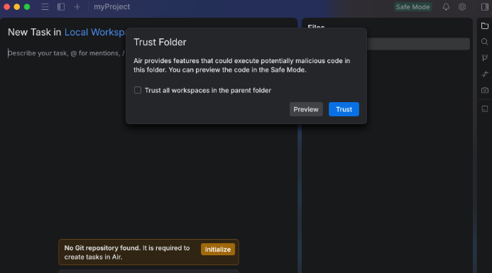 - 信任代码 :首次打开时,Air 会询问是否信任项目代码(执行代码可能存在风险,仅信任可信来源)。