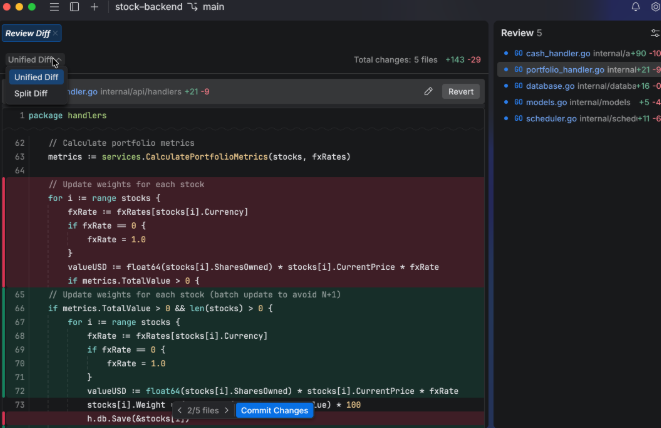 任务完成后,切换到 Review 标签页,通过差异面板(diff)查看 AI 修改内容: