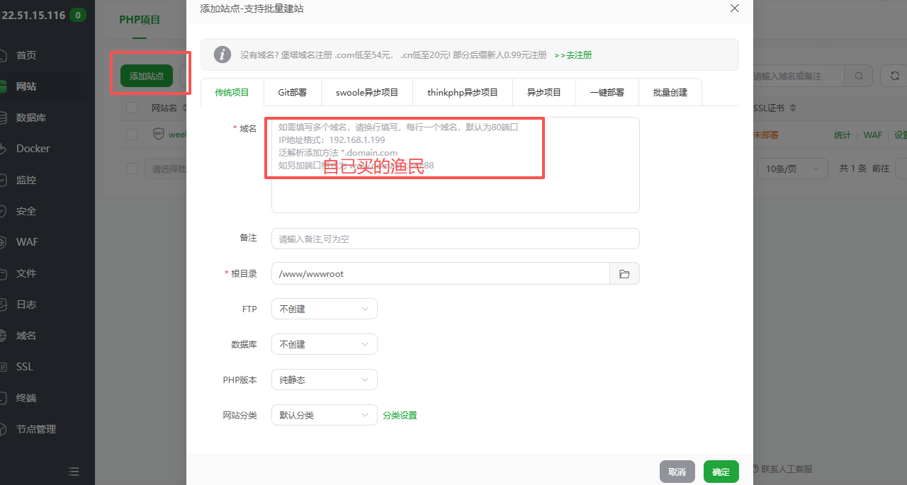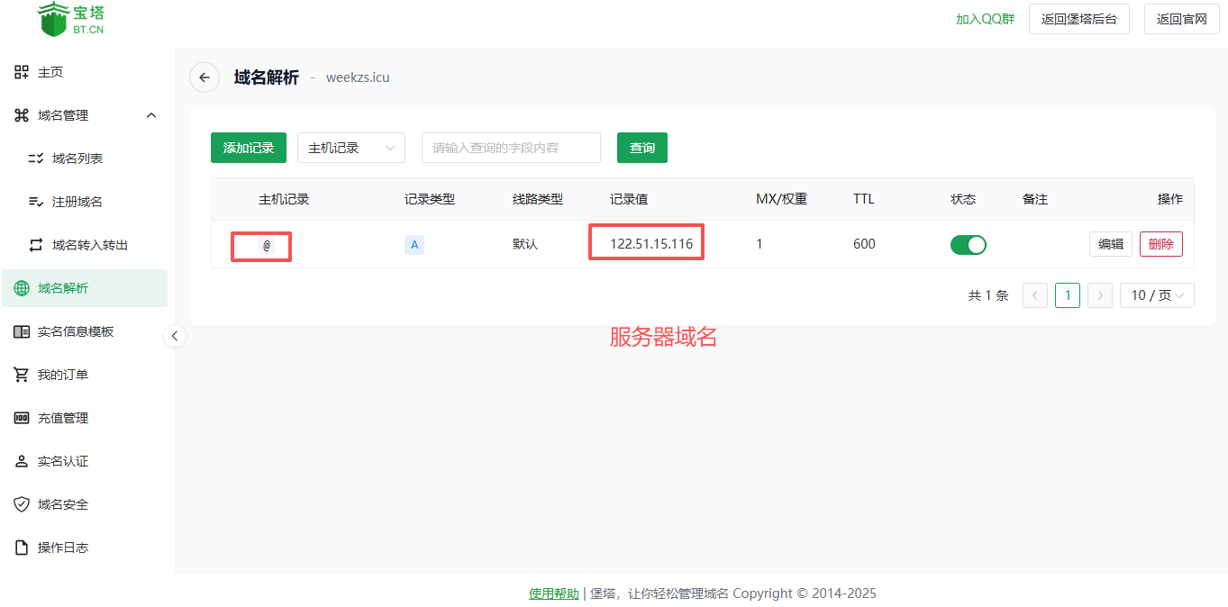 记得复制宝塔服务器的ip去宝塔域名里面解析