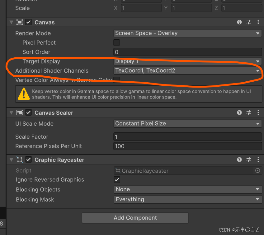 也许你发现了,我使用Image组件的颜色值来确定进度条的参数,其中:红色通道为进度值,蓝色通道为起始角度的偏移,绿色通道为圆环的厚度。这样做的原因是:如果不使用这种方法,那么,当你的场景中有多个这样的进度条时,你想分别控制这些进度条的属性,那么你就不得不为他们每一个创建一个单独的材质球,否则他们的参数全都共享自材质球而不是自身,也许你会想到使用GPU Instance,通过设置MaterialPropertyBlock来分别为每个进度条设置参数,但是遗憾的是,在UI渲染器上,并不支持MaterialPropertyBlock。所以,我们使用了一个更优秀的方法,即,通过顶点颜色来控制这些参数。