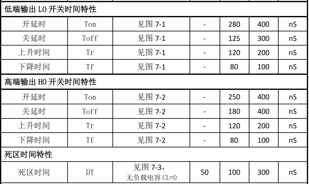 死区时间(DT) 内部集成,典型 100ns(范围50-300ns,无负载电容时)