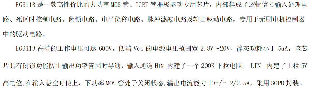 在无刷电机驱动、高压电源转换及各类逆变应用中,EG3113是一款经久耐用、性价比突出的经典栅极驱动芯片选择