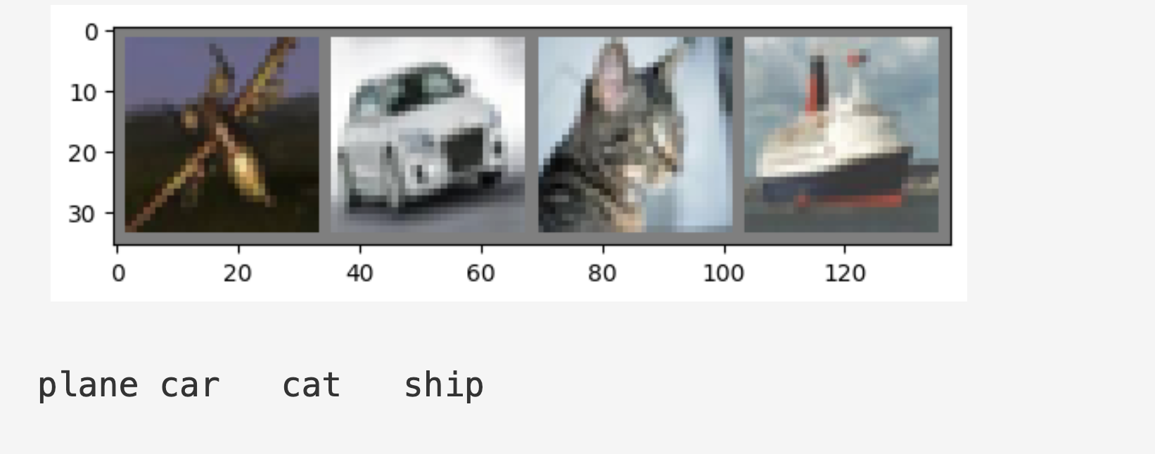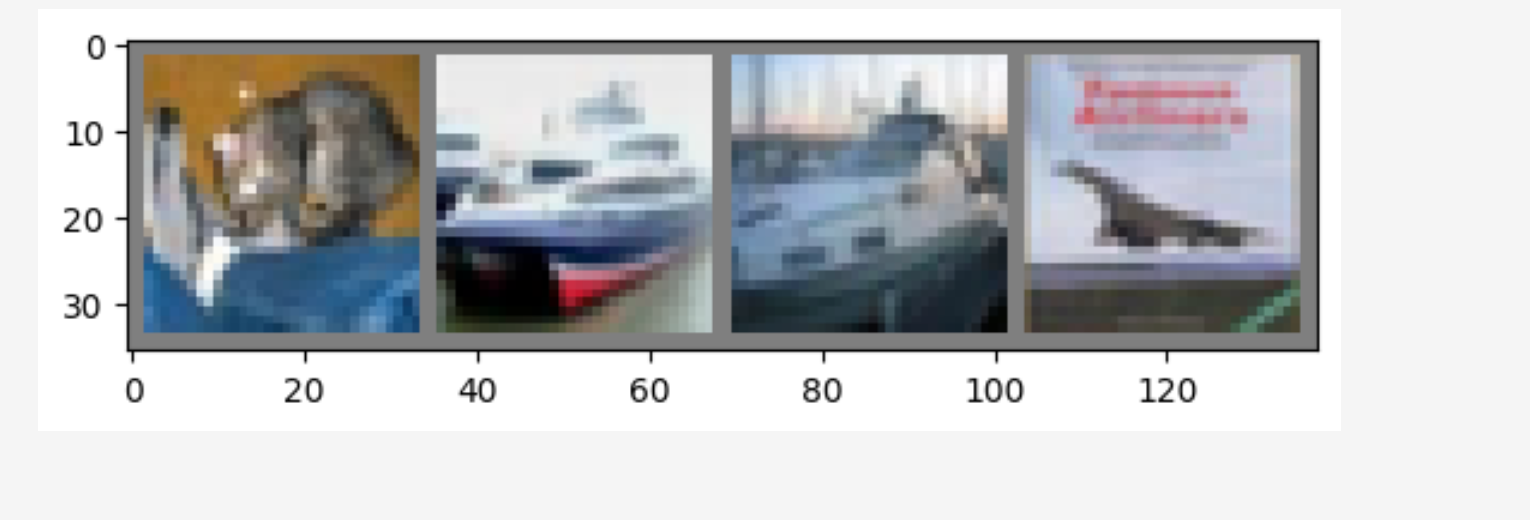 classes[labels[j]]:labels[j]是类别的数字索引(如 0, 1, 2),通过classes列表找到它对应的名字(如 'cat', 'dog', 'ship')。f'...:5s':格式化字符串,保证每个单词占用 5 个字符宽度,使打印出来的文字能和上面的图片对齐。' '.join(...):将这些名字用空格连接成一行字符串并打印。