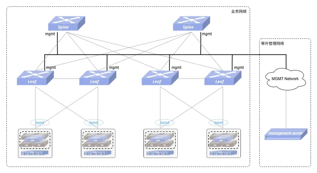 提供基于会话的完整事务机制(提交、确认、回滚),确保核心网络配置变更的绝对准确性。(以下是一个典型的数据中心带外管理网拓扑:)