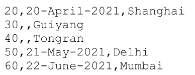 此属性允许传递给此属性的给定值被视为空值。 让我们看一个例子。 下面的文件包含3列,但有3行(第2,第3和第5行),其中第二列的值缺失。 与第二行一样,在值20之后,第二列的值缺失。
