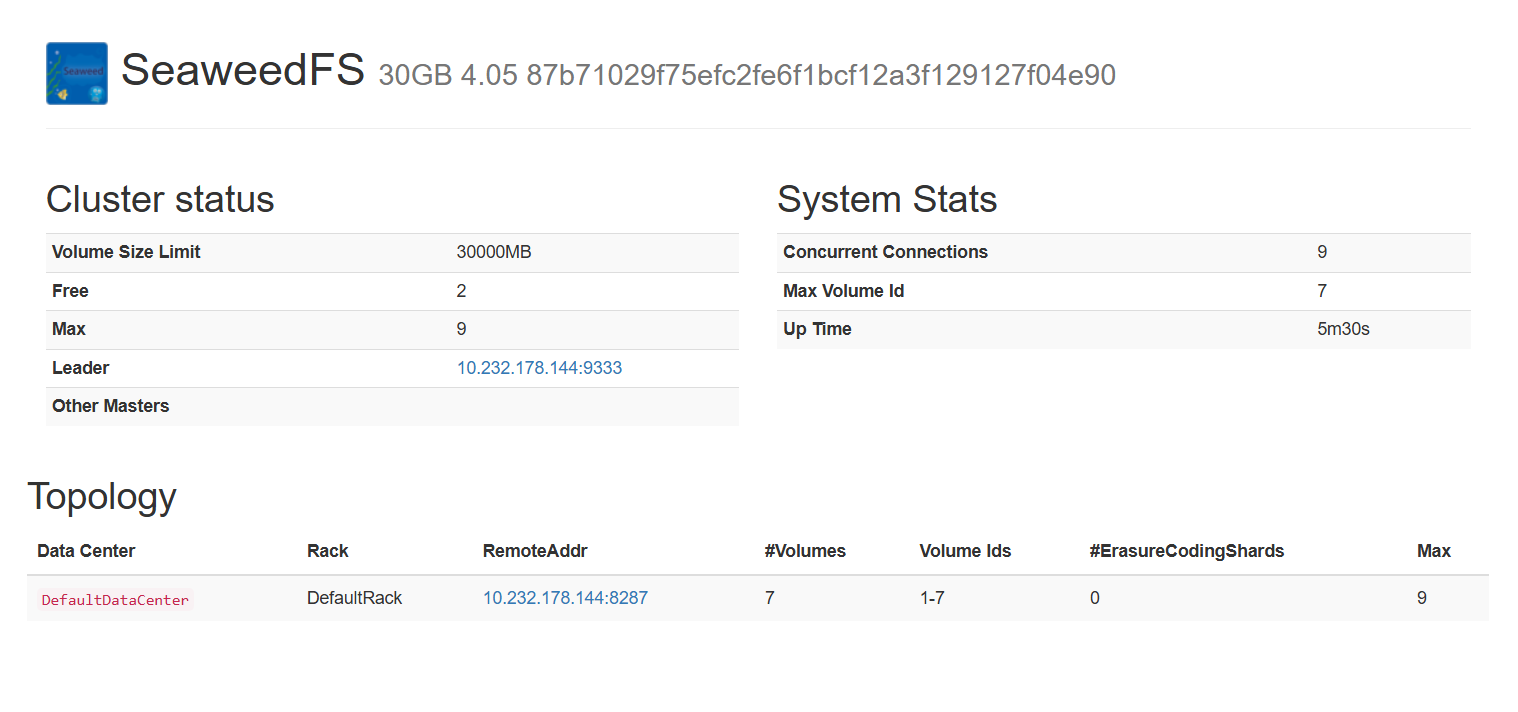 | Master | weed master -port=9333 -defaultReplication="000" |