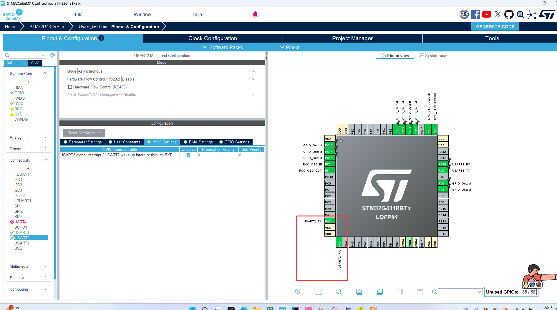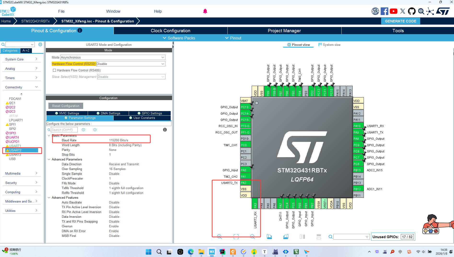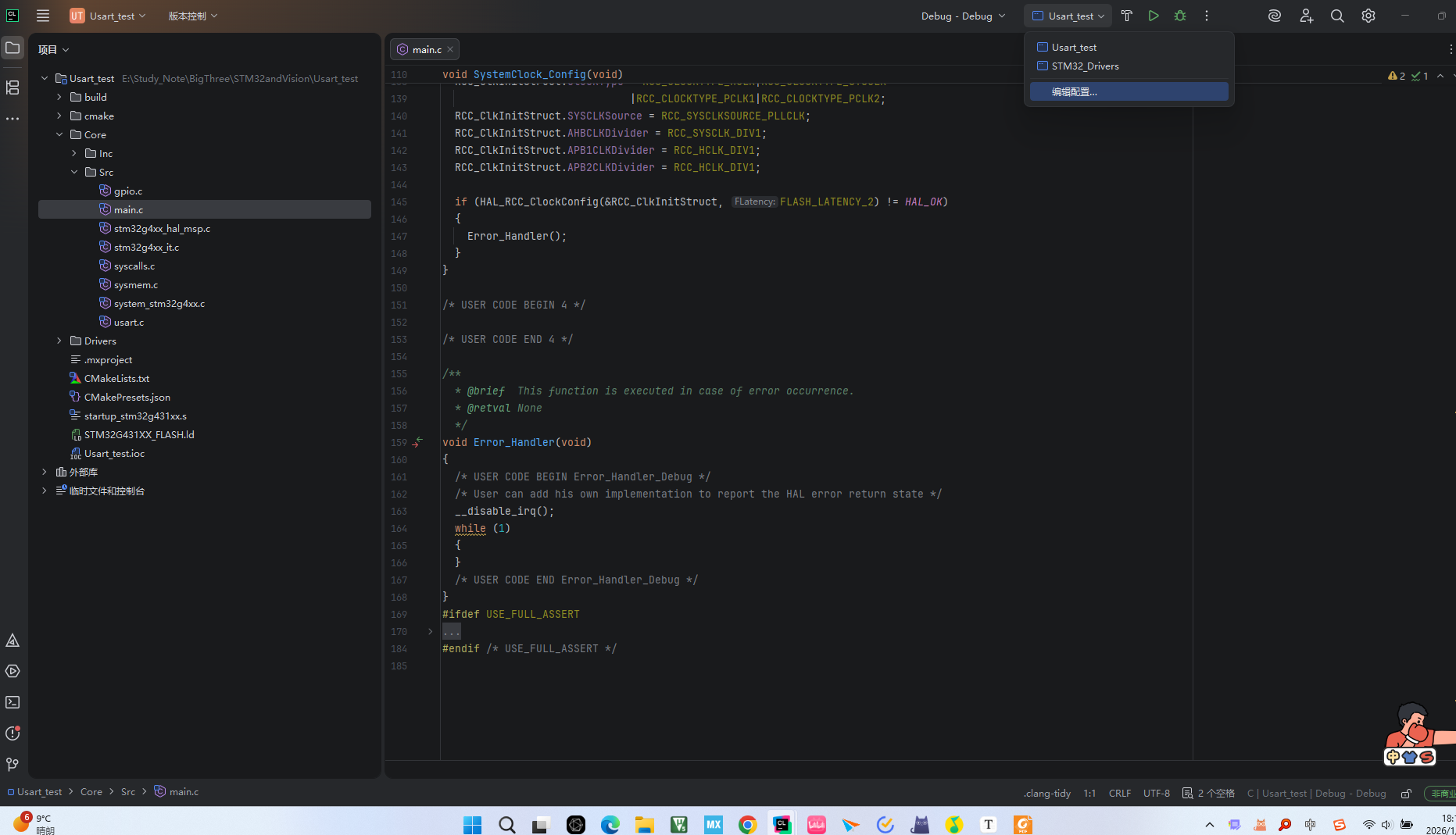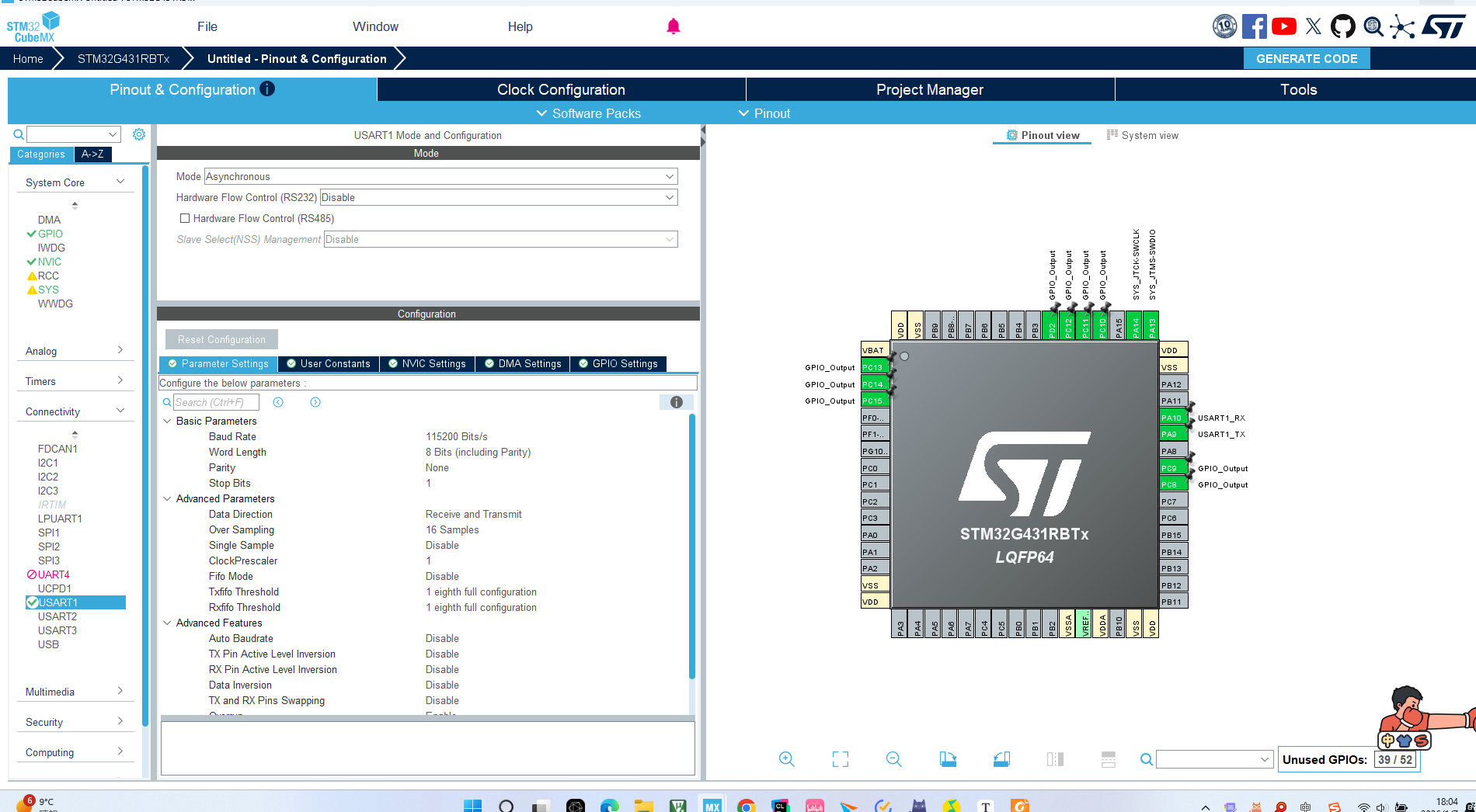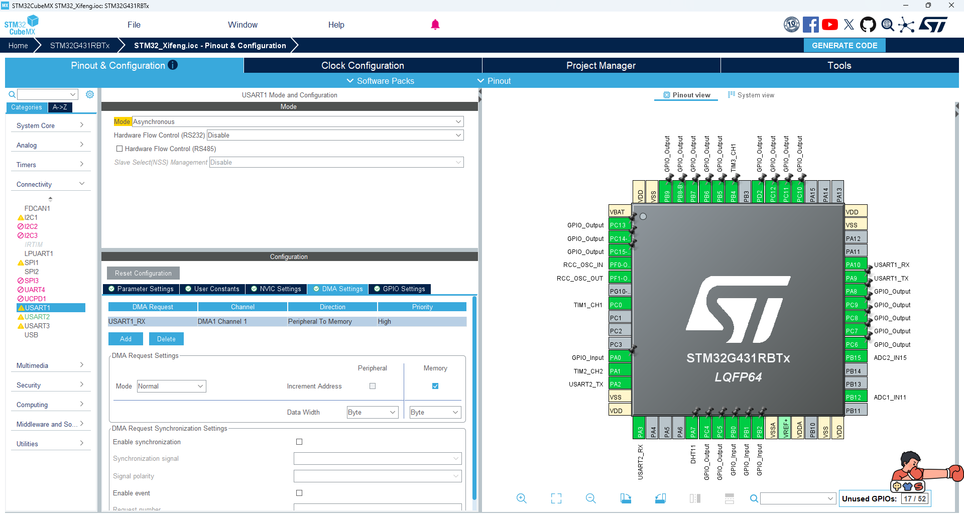 串口我这里还要选USART1,因为我单片机的的USART0是和烧录器在一起的,所以后续没法接线和视觉模相连,所以我需要使用USART1与视觉模块相连
