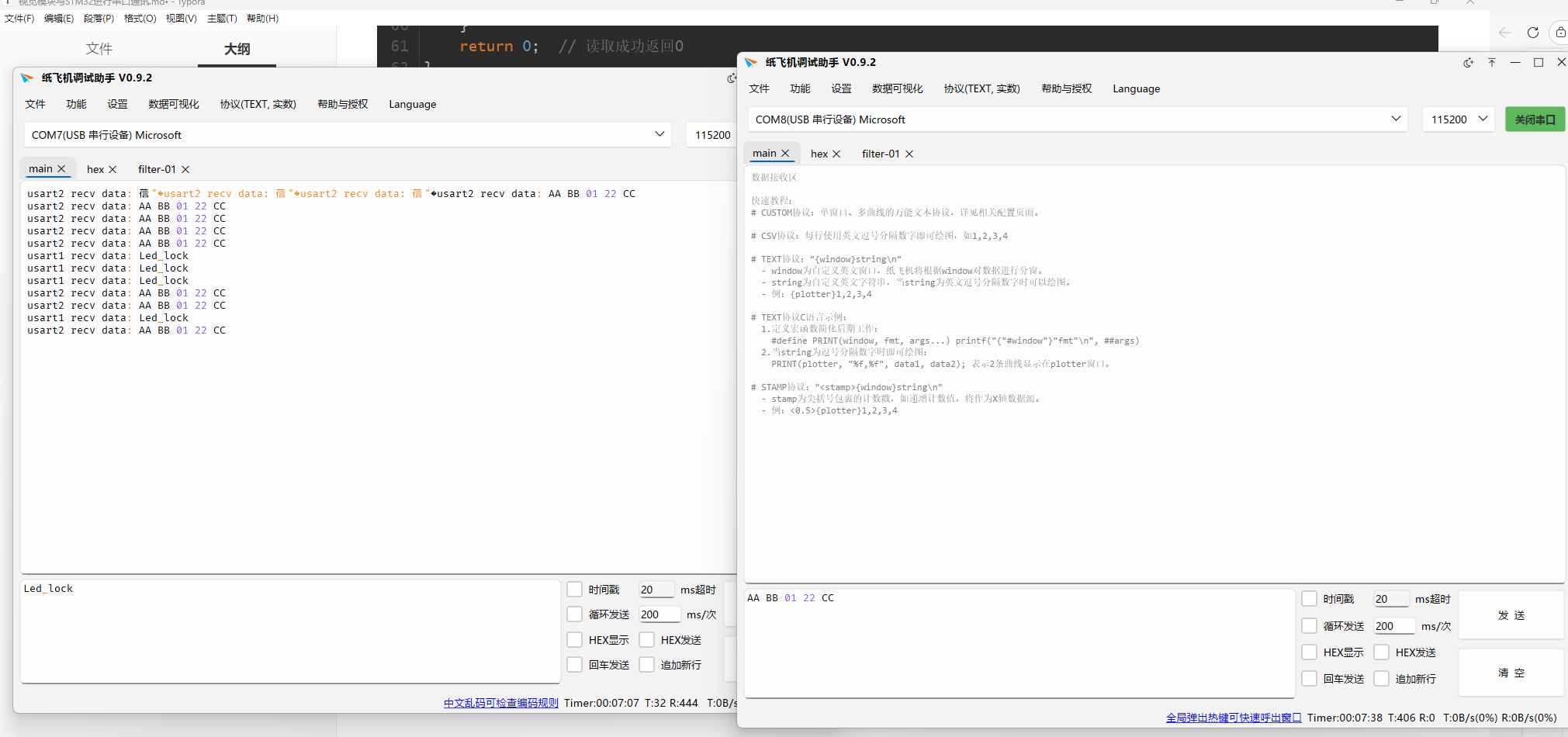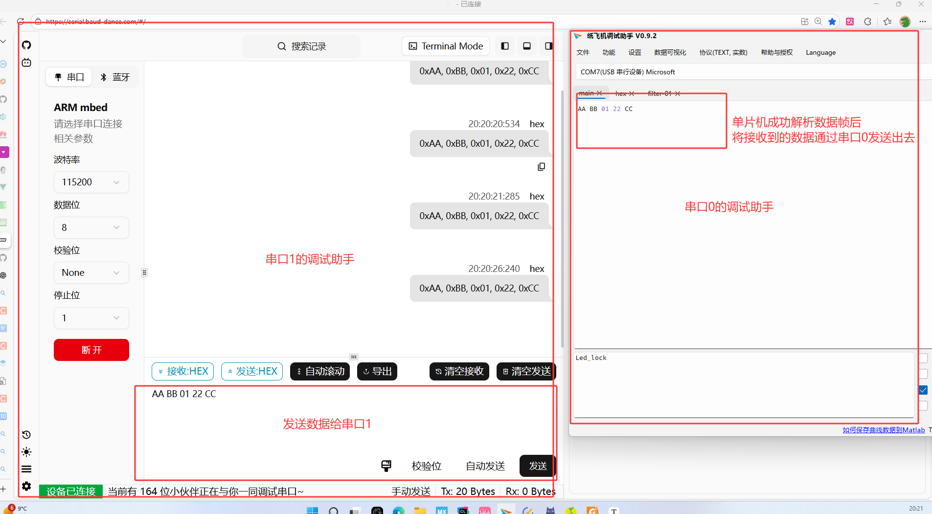 这个代码就是解析数据帧,我通过电脑的串口调试助手1发送数据给单片机,如果数据为正确的数据帧则,再通过串口0发送出去