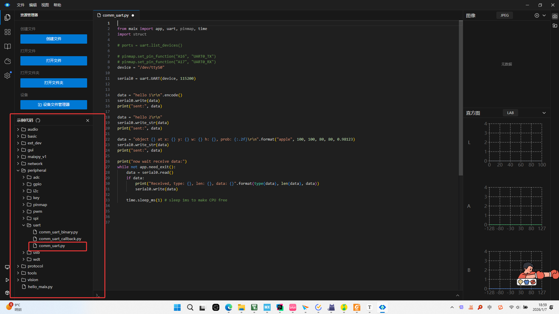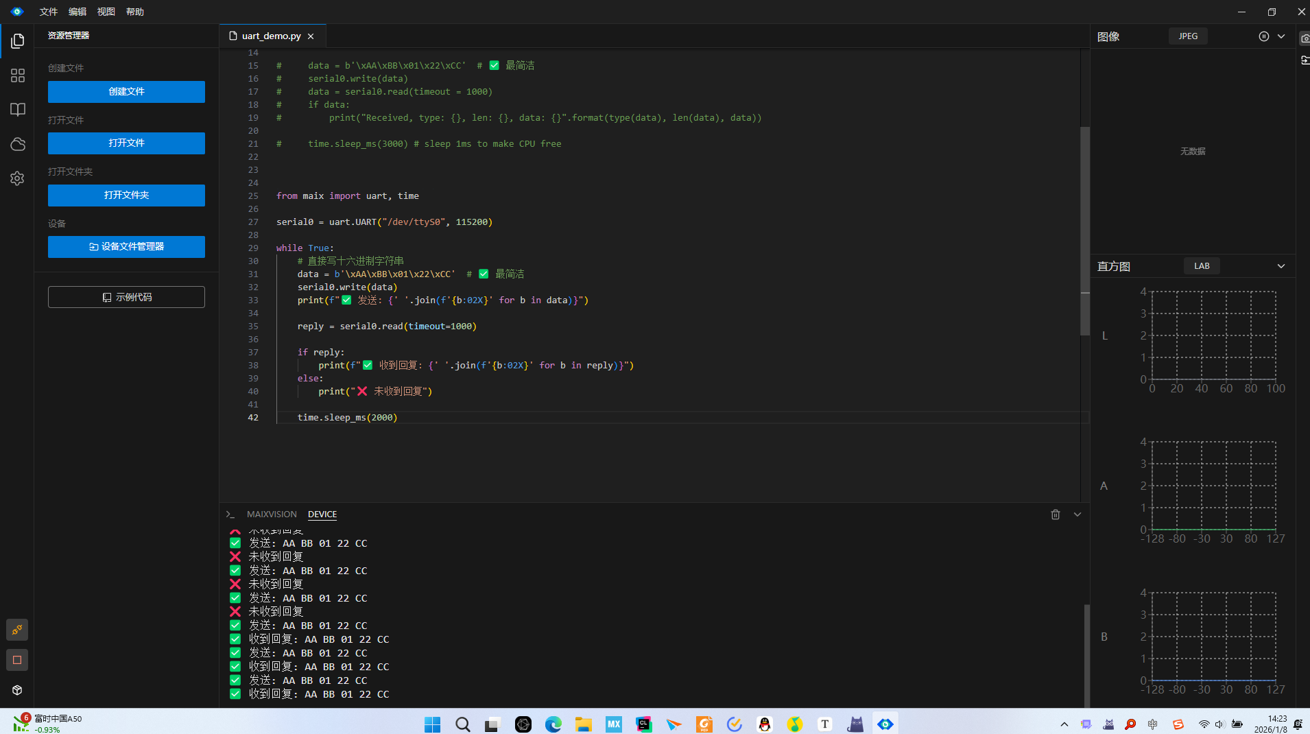 这里我出现了一些问题,我不知道为什么我的视觉模块好像发送数据好像有问题,但是我不知道他具体是的发送还是接收有问题,所以我问了一下ai他让我进行回环测试即把maixcam的视觉模块的Tx和Rx接在一起,然后烧录下面的代码:
