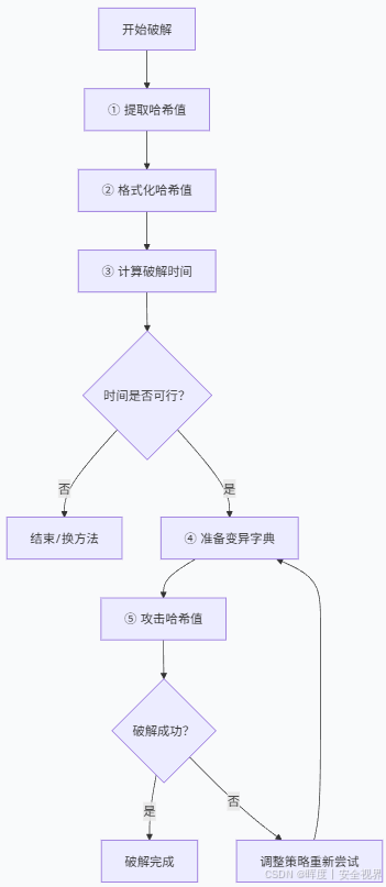 | ⑤ | 攻击哈希值 | 执行破解操作 | Hashcat、John the Ripper等 | 注意哈希值输入格式,确认算法类型 |