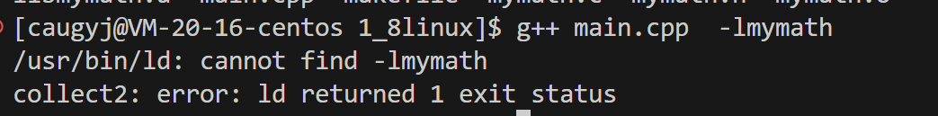 这里显示cannot find -lmymath也就是说,系统默认路径下找你这个库文件没有找到,当然找不到了!你只让我找库名为这个的,你又没告诉我在哪找!-L +路径,表示在指定库路径中寻找!