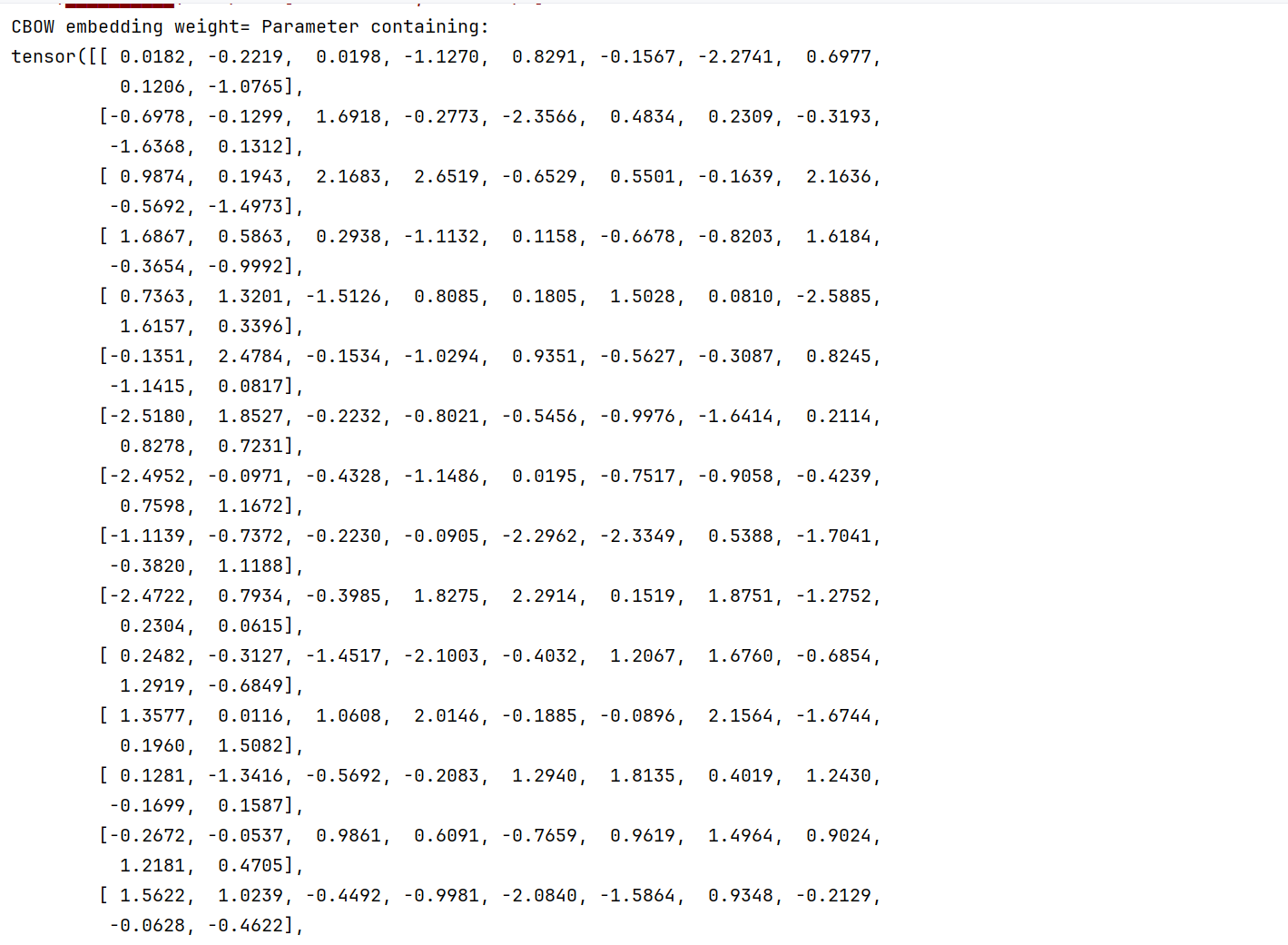 print("CBOW embedding weight=", model.embeddings.weight) # GPU