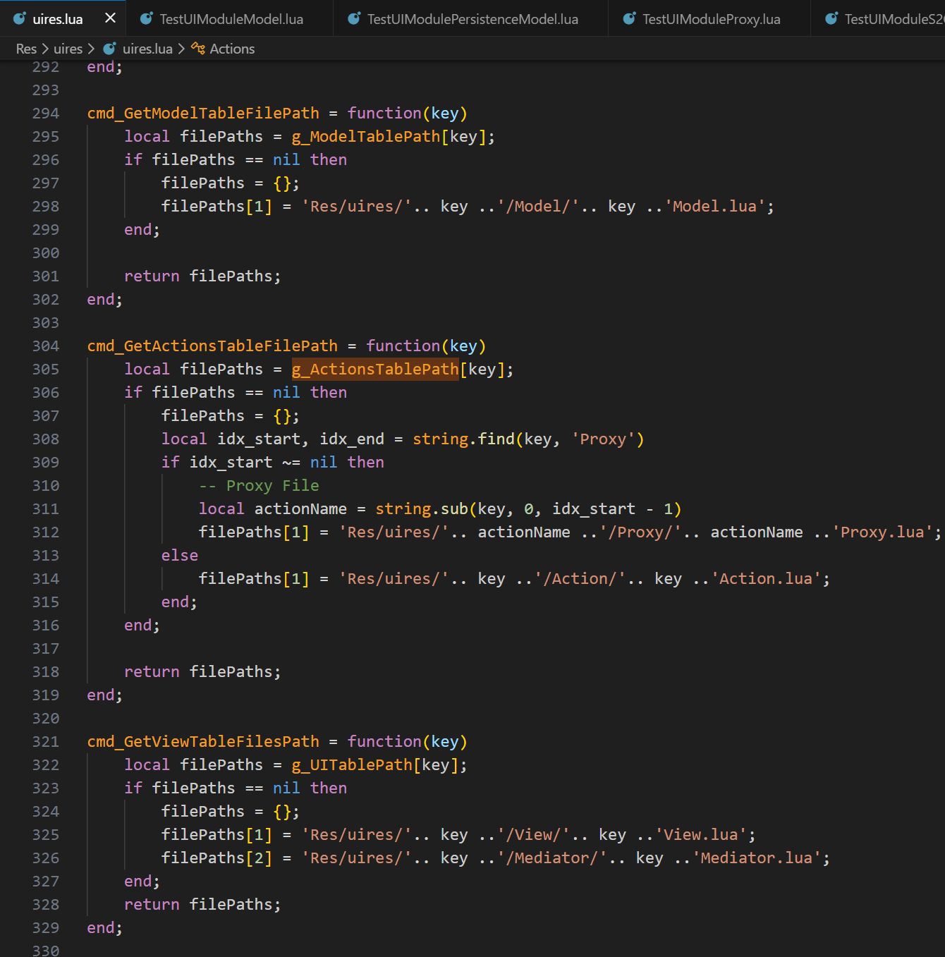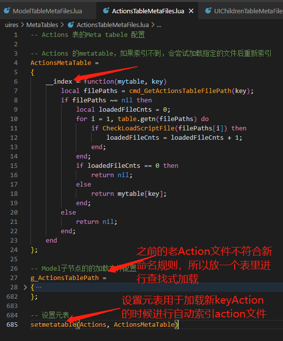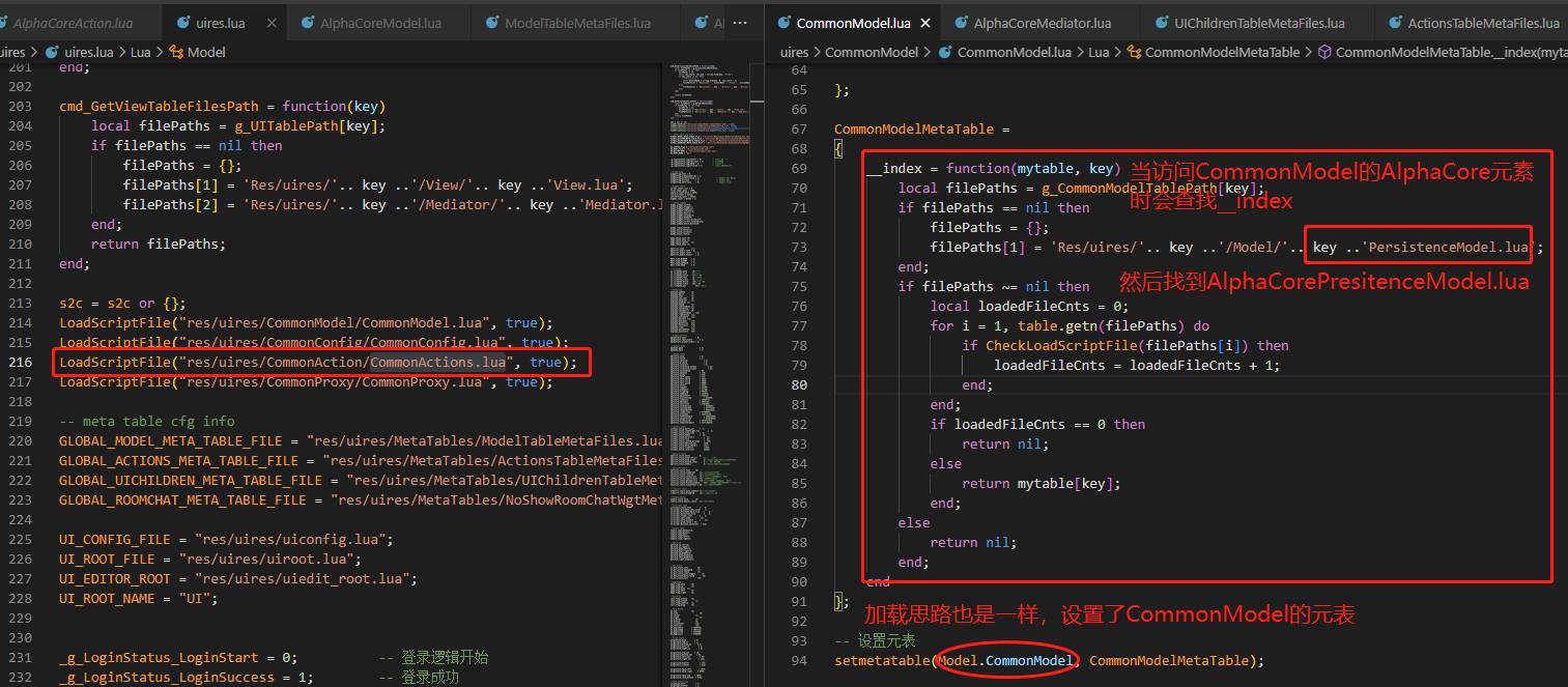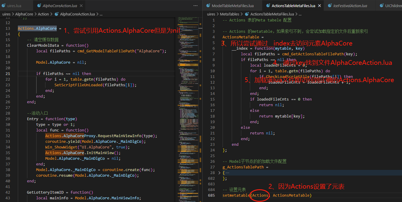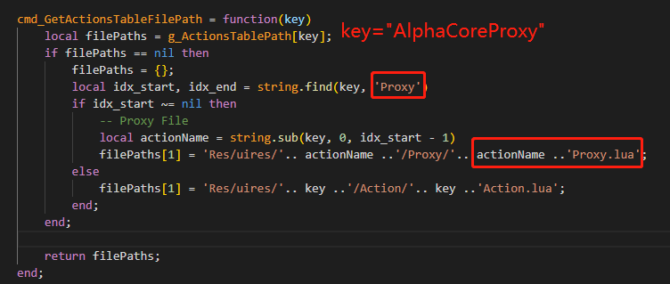因为协议处理函数和Actions.AlphaCore不在一起,而是另外声明了一个table:Actions.AlphaCoreProxy,其访问加载思路基本一样:当访问Actions.AlphaCoreProxy的时候会查找Actions的元表,这里会进行字符串匹配"Proxy"来决定加载到AlphaCoreProxy.lua而已: