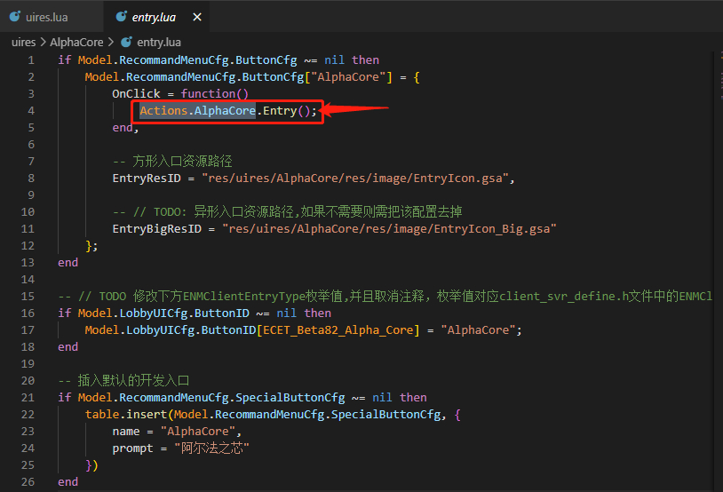 (1)入口点击是要执行函数:Actions.AlphaCore.Entry();但是AlphaCoreAction.lua并没有加载;所以会查询Actions这个table的元表__index,见下图(key=Alpha)