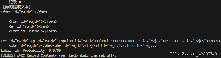 注意,WET 文件包含 HTTP 头(例如,Content-Length),这些不属于提取的文本内容。查看第一个示例,你会发现其中包含从刚才看到的原始 HTML 中提取的文本。