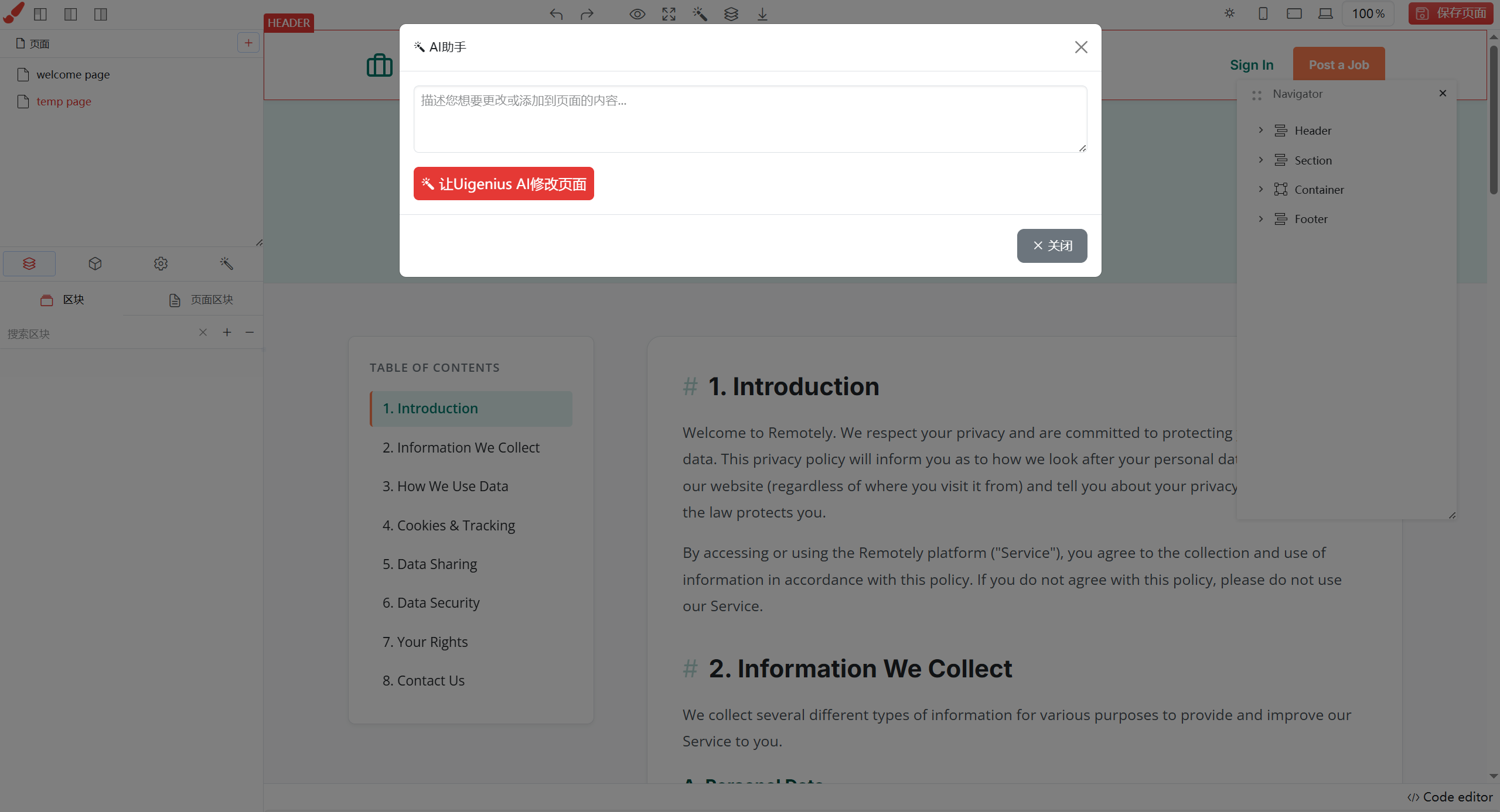 可以使用AI 即时修改页面,大大提高人编辑产出UI的生产效率