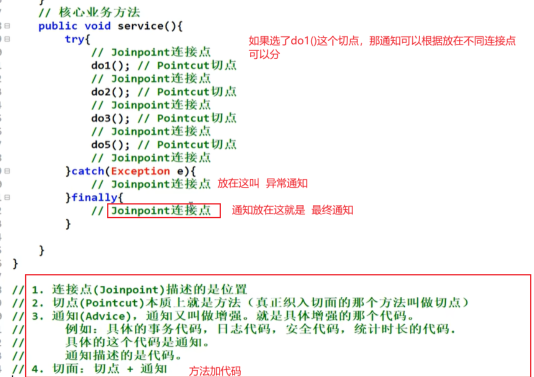 程序执行流程中真正织入切面的方法 (一个切点对应多个连接点)。简单说:切点是 "要增强的方法" (比如generate()方法),而切点表达式可以匹配多个方法(比如所有*Service类的方法)。
