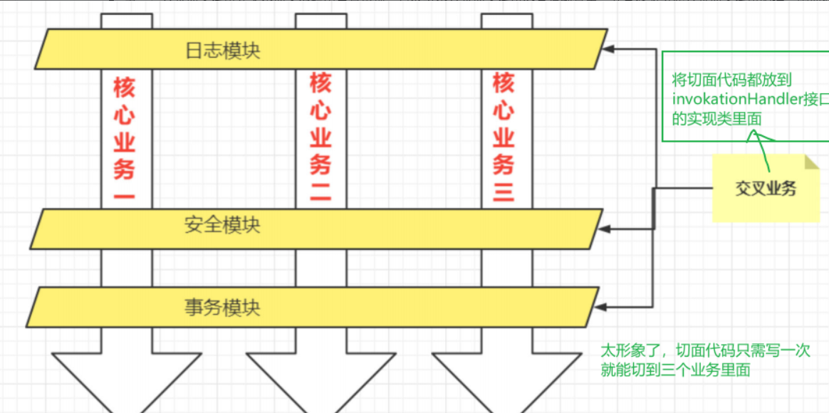 - 横向:日志模块、安全模块、事务模块(这些是所有核心业务都需要的交叉逻辑)。
