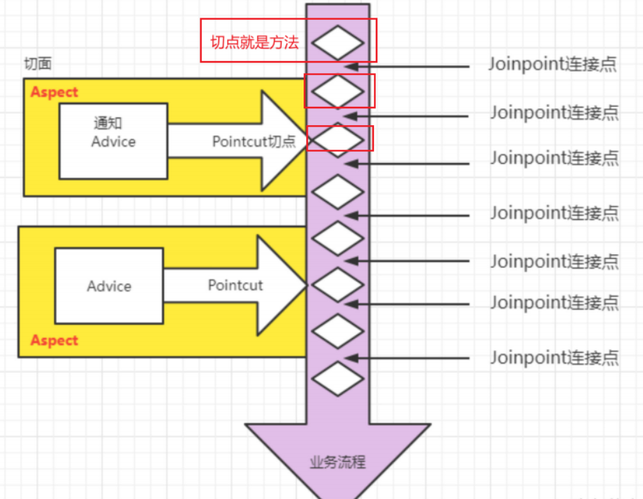 - 切面是横向的,通过 "切点"(方法)找到业务流程中的位置,再把 "通知"(代码)织入进去。
