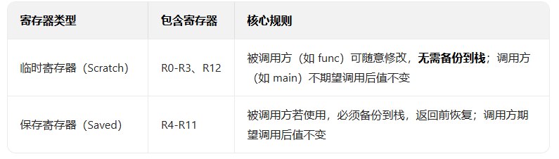 ✅ 临时寄存器(R0-R3、R12):调用方(如 main)不保证这些寄存器的值在函数调用后不变,被调用方(如 func)可以随意使用,无需备份;