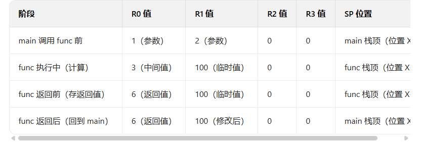 ✅ 保存寄存器(R4-R11):被调用方(如 func)如果要使用这些寄存器,必须备份到栈中,函数返回前必须恢复原值(否则会破坏调用方的寄存器数据);
