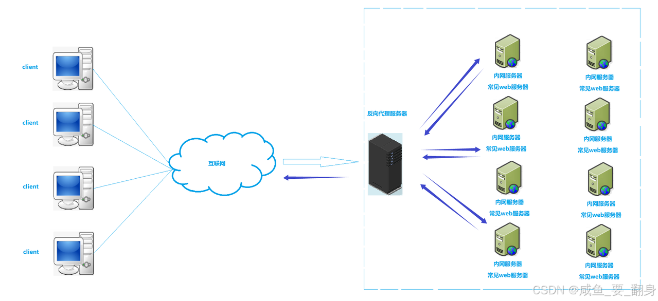 典型架构:客户端 → 互联网 → 反向代理服务器 → 内网 Web 服务器集群