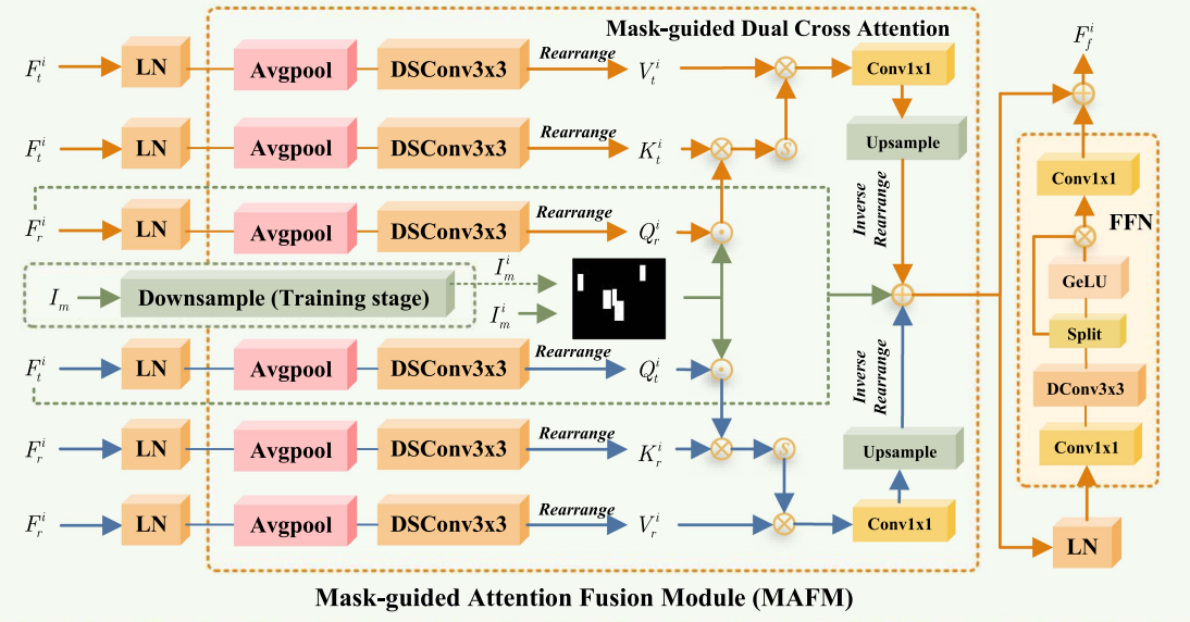 基于生成的掩码特征,COFNet 设计了 Mask-Guided Attention Fusion Module(MAFM)。该模块在跨模态注意力计算过程中对 Query 进行掩码加权,使跨模态相关性建模主要集中于目标区域。通过双向 cross-attention 机制,RGB 特征与 Thermal 特征在掩码约束下相互补充,从而有效抑制背景区域带来的跨模态干扰,并缓解由模态差异引起的伪响应问题。