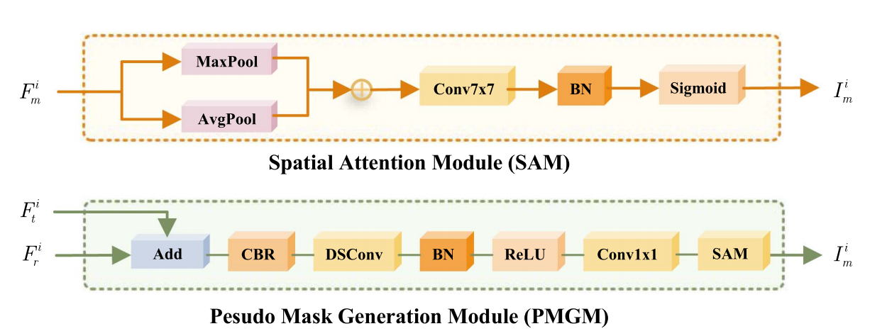如图可知,PMGM 由一条主干掩码生成分支与一个空间注意力子模块SAM 级联构成,其核心目标是在推理阶段不依赖 GT mask 的前提下,仅利用 RGB 与 Thermal 的编码特征 自适应生成目标区域的伪掩码,从而消除训练阶段"有掩码引导"与测试阶段"无掩码先验"之间的结构不一致问题。具体而言,PMGM 的输入为同尺度下的两模态特征RGB和Thermal, 首先通过 Add 操作进行逐元素叠加得到融合响应,以在不引入额外注意力权重的情况下汇聚两模态的目标显著性线索。