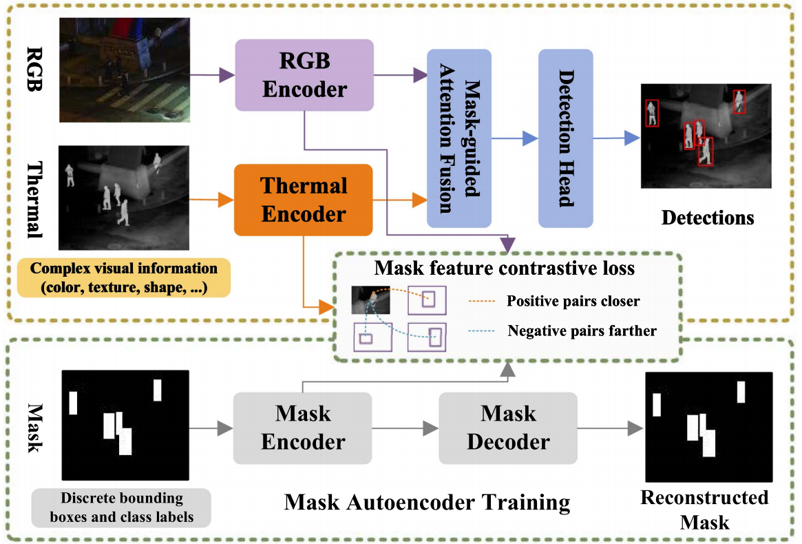 COFNet面向 RGB--Thermal 多光谱目标检测 ,认为"跨模态融合"里最关键的不是把特征拼起来,而是让融合过程显式聚焦在目标区域(object region) ,避免背景主导的无效交互;因此它用 box-level mask(由GT框构造) 来"指哪打哪"地引导跨模态注意力融合,并进一步用对比学习把"模态特征 ↔ mask特征"在表示空间里对齐,增强目标响应与跨模态一致性。