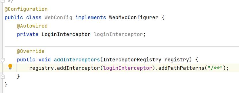 实现WebMvcConfigurer接⼝,并重写addInterceptors⽅法,在add中加入你之前自定义的拦截器即可,addpath部分加入的是拦截的访问,/**表示全部拦截