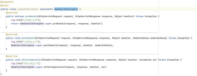 首先需要一个类去继承HandlerInterceptor接⼝,并重写其所有⽅法,这里的方法分为三个,一个是pre(执行代码前),一个是post(执行代码后),一个是after(渲染结束后),只有当pre里面我们写的代码执行成功之后,返回一个true,才会执行其他的下一步操作