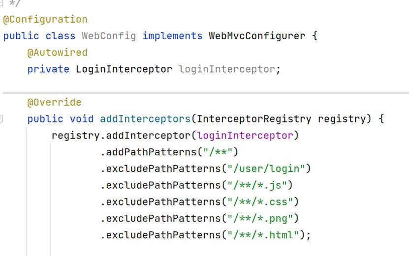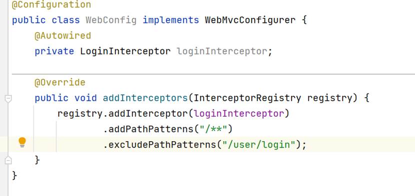 首先需要一个类去实现实现WebMvcConfigurer接⼝,并重写addInterceptors⽅法和excludePathPatterns方法,这里主要就是把你自己实现的拦截器放进来,然后把你要拦截的,放行的写进去,这样自定义的拦截器才知道要拦截什么,什么不拦截
