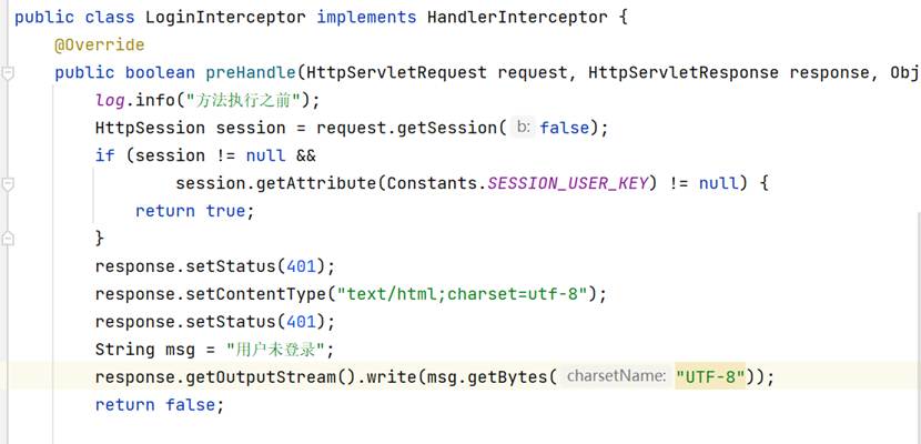 如果改为false,我们访问任何的资源都会被拦截,无法继续执行到下一步,只有是true的时候,才会被允许访问