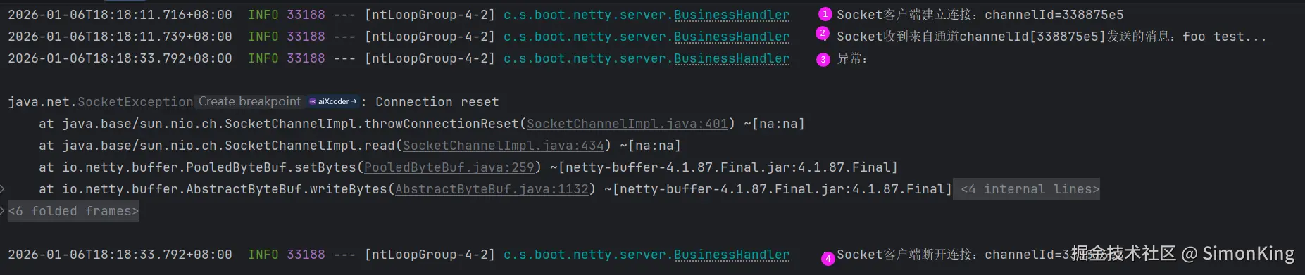 而其中DelimiterBasedFrameDecoder的maxFrameLength参数用来控制接收消息的最大字节大小,超过就会异常。