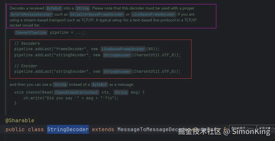 按照注释的案例,我们就可以配置。而StringEncoder是用来发送消息的解码器,用来将字符串转成ByteBuf。