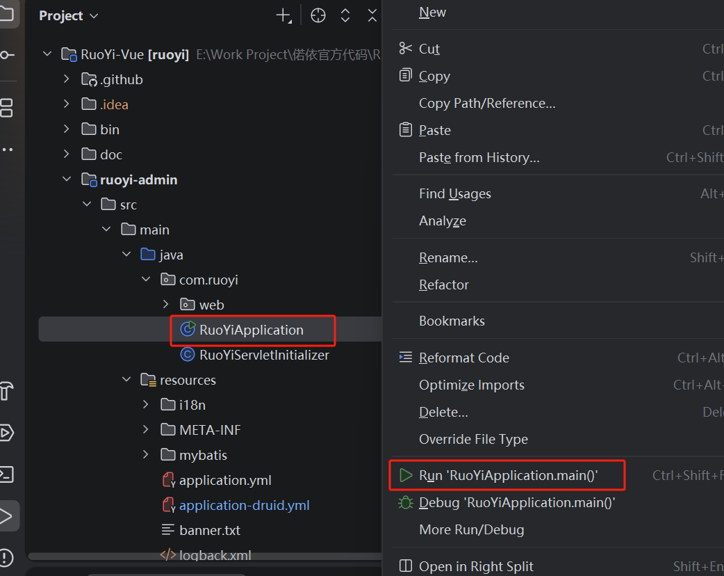 RuoYiApplication.java,右键→Run 'RuoYiApplication'; -