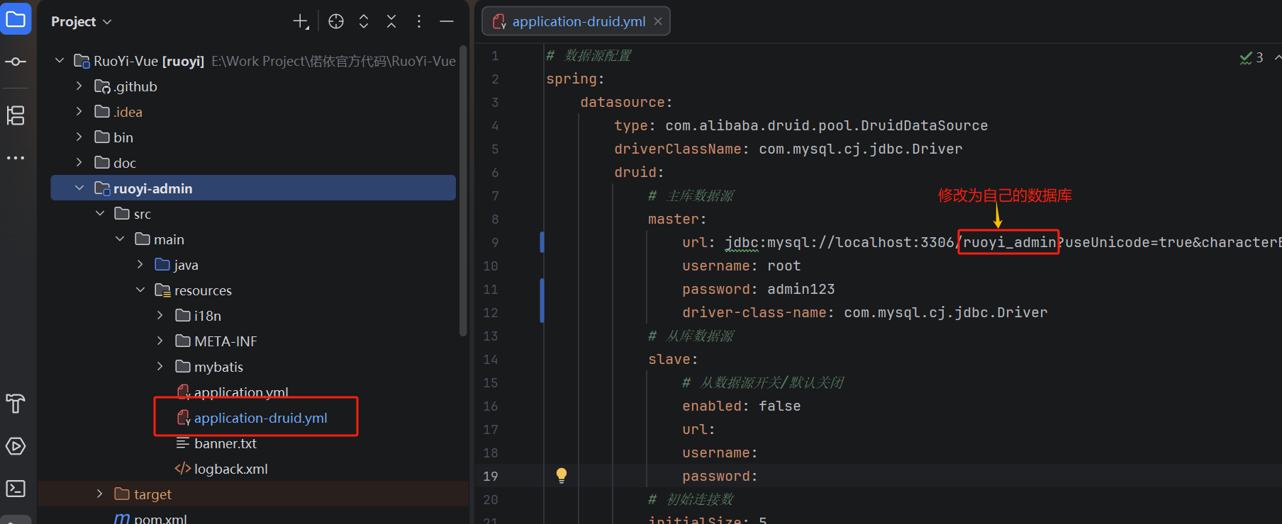 YAMLspring: datasource: druid: master: url: jdbc:mysql://localhost:3306/ruoyi_admin?useUnicode=true&characterEncoding=utf8&zeroDateTimeBehavior=convertToNull&useSSL=true&serverTimezone=GMT%2B8&allowPublicKeyRetrieval=true&nullCatalogMeansCurrent=true username: root # 本地MySQL用户名 password: 123456 # 本地MySQL密码 driver-class-name: com.mysql.cj.jdbc.Driver # 8.0专属驱动