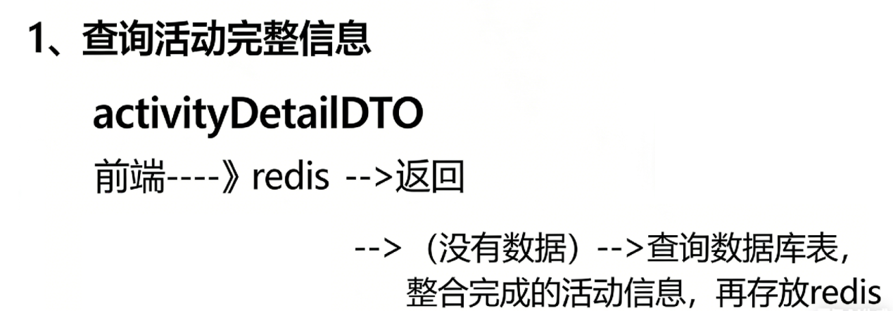 图示即为后端的流程图,我们先前将活动的完整信息定义在activityDetailDTO这个对象里面,我们先前将他存放在了redis中(先前没有存放redis成功也没有关系),因为我们如果在redis找到直接返回,没有找到就去库表里面查找,然后在整合完整信息存放进redis中(为下次查询加快速度),然后返回结果,以下是时序图以及接口定义