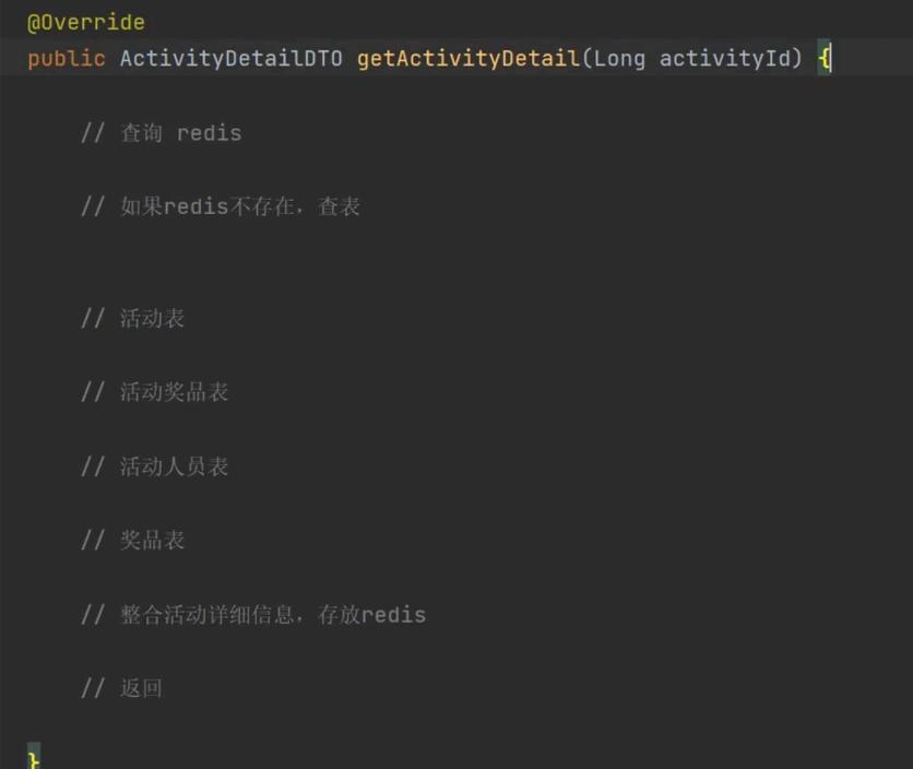 后面的两种情况是预料之中的,我们直接查四张表获取到相应的数据,通过这四个表然后在整合完整的活动信息构建ActivityDetailDTO对象然后将他存放到redis中去,最后直接返回。注意这里通过四个表构建ActivityDetailDTO方法和,存放redis(在该方法中我们已经设置好了存放的key,以及过期时间,直接调用即可),以及从redis中取ActivityDetailDTO,这些方法我们在创建活动的时候,以及写了,我们这里直接调用即可,以及在这里写一些sql即可完成该方法