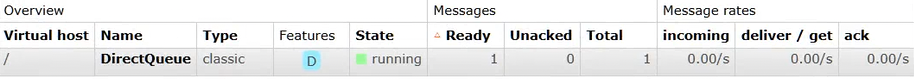 这里我们可以先测试一下能不能往消息队列中推送消息成功,写一个测试方法即可,测试后我们可以去RabbitMq的web控制页面查看是否推送成功,因为我们现在只有生产者,没有消费者,所以这个消息会一直存在在队列里面。看如下视图ready,和total