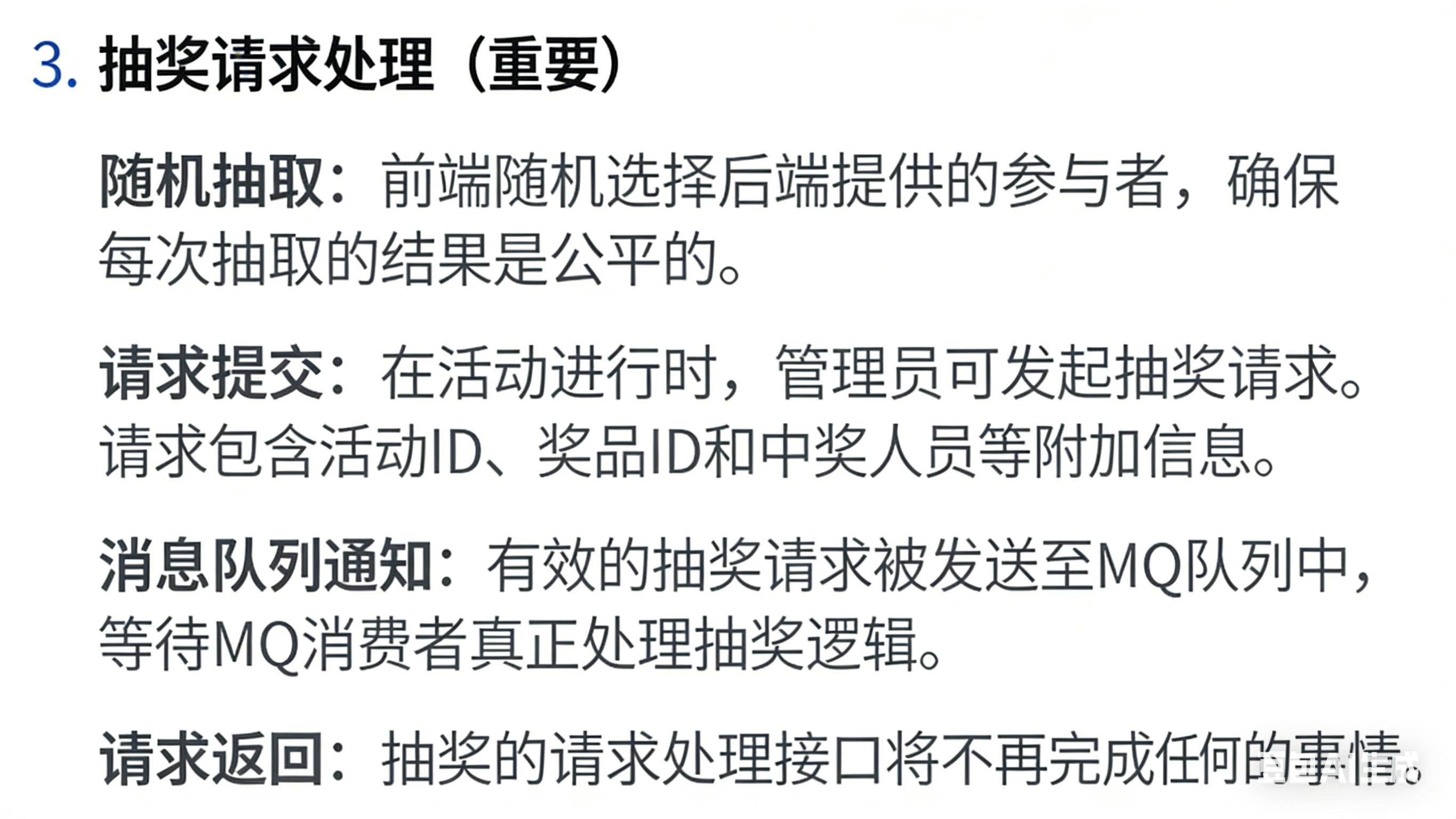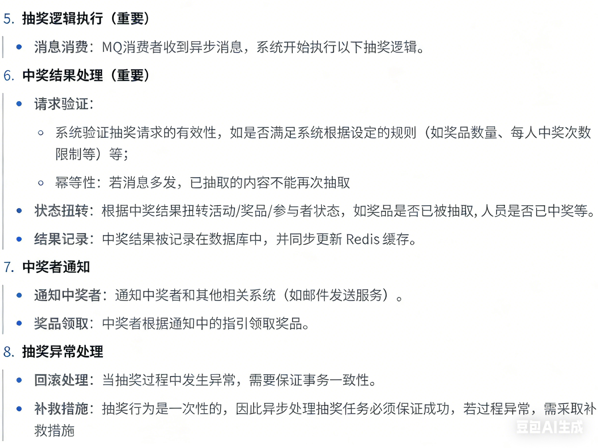 通过以上流程,抽奖系统能够确保抽奖过程的公平性和⾼效性,同时提供良好的⽤⼾体验。⽽且还整合了 Redis 和 MQ , 进⼀步提⾼系统的性能。