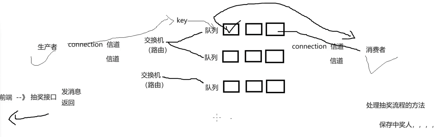 完成了rabbitmq的配置以后我们相当于完成了中间部分的代码,我们现在只需要完成生产者和消费者,我们的生产者就是抽奖接口,这个接口就是接收前端发来的带着参数的抽奖请求,我们这个接口只做两个事情,将消息放入消息队列,然后直接给前端返回结果 消费者就是:处理抽奖流程的方法,他从消息队列中拿消息,并且处理,这里比如保存中奖人,扭转状态,以及通知行为等,我们接下来就是需要完成这两部分的代码
