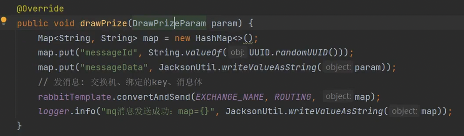 这个对象定义了rabbitmq所有的发送接收的行为,使用这个方法来对消息队列进行一些操作,这里我们向消息队列推送的方法使用convertAndSend(交换机名String,交换机队列绑定的keyString,消息体),(这个方法重载了很多可以自行阅读一下)注意我们这里消息体会被自动转换成json(我们在配置类中设置了转化成json),因为对于rabbitmq和redis这种,