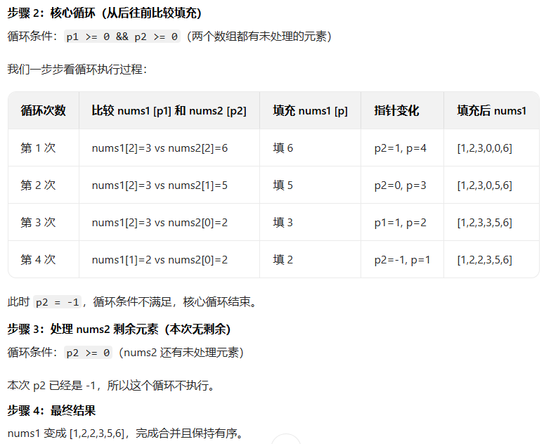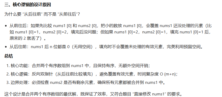 这种方法无需额外空间,时间复杂度为O(m+n),是合并有序数组的高效解决方案。