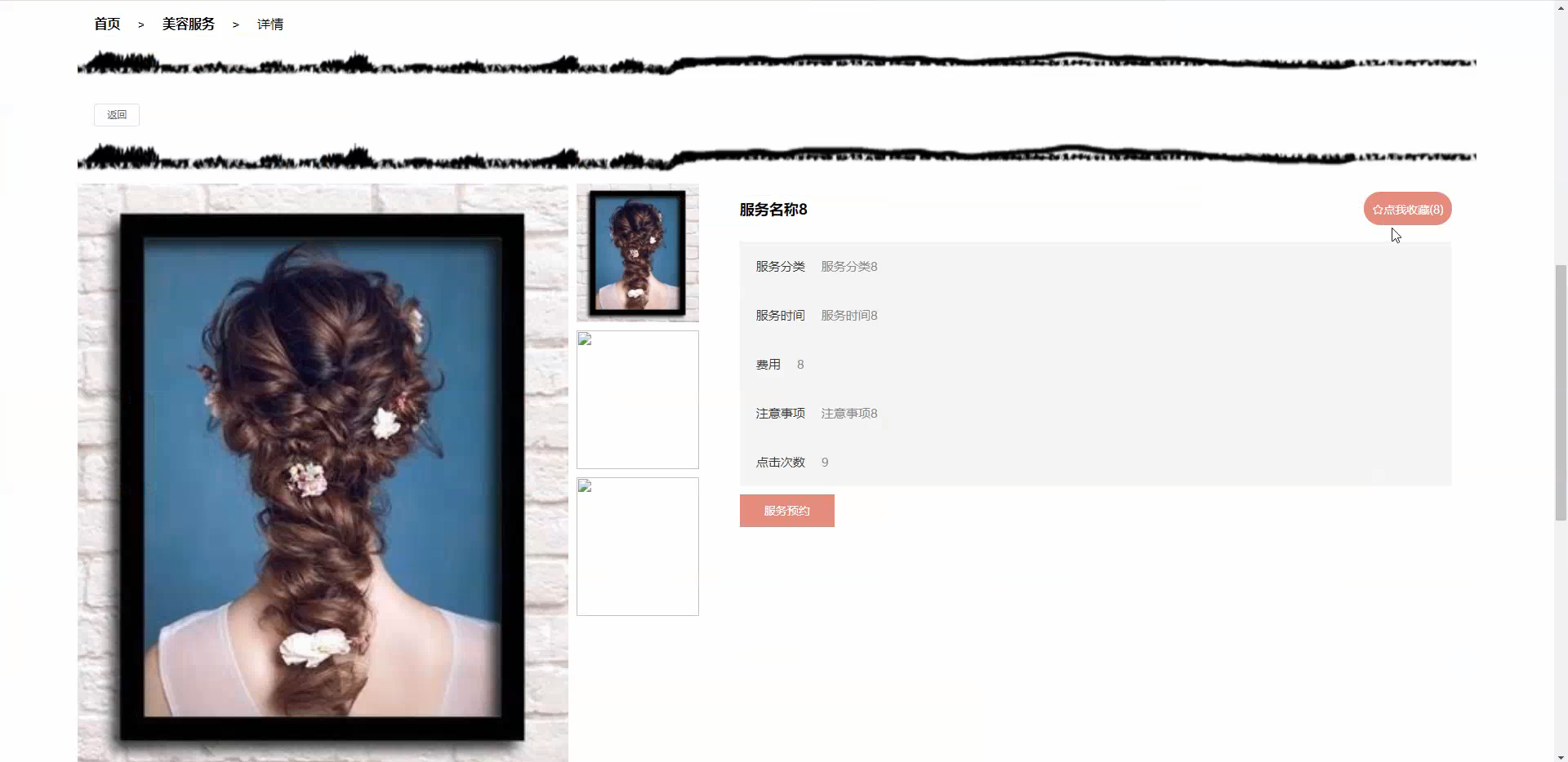 - 服务项目展示:展示美容院提供的各种服务项目及其详细信息。