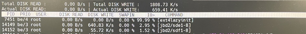 iostat -dxm 1监控磁盘 IO,发现某个磁盘的 IO 并发度和 svctm 都很高,但实际并无数据读写操作。此外,通过iotop -P发现ext4lazyinit进程占用较高 IO,该进程用于在后台逐步初始化 inode 表。监控到的进程状态如下图所示: -